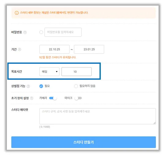 스터디룸 내부 스터디 관리에서 목표시간을 수정할 수 있습니다.