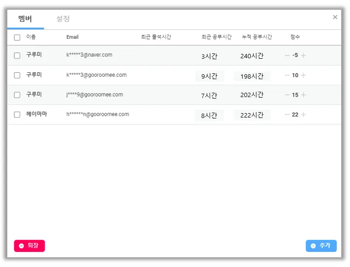 비공개 스터디룸에서 스터디 관리를 클릭해 초대 스터디룸에서 현재 입장해 있지 않고 퇴장한 스터디원들의 공부시간도 확인해 보세요!