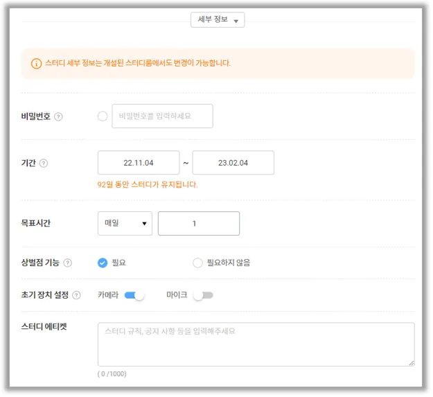 스터디룸을 개설한 이후에도 방 정보에서 비밀번호 설정 및 변경이 가능해요!