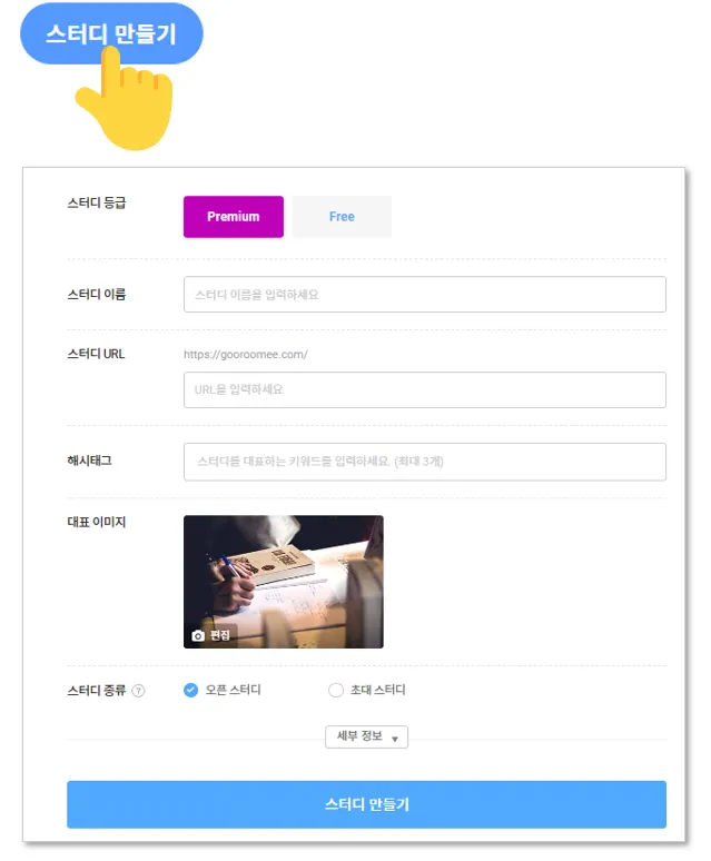 프리미엄 유저만 입장이 가능한 프리미엄 스터디룸, 모든 유저가 입장이 가능한 프리 스터디룸 중 한 가지를 골라 개설해 주세요.