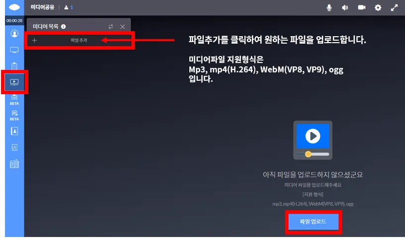 미디어공유는 동영상 파일을 업로드해 동시에 동영상을 시청할 수 있는 기능입니다.