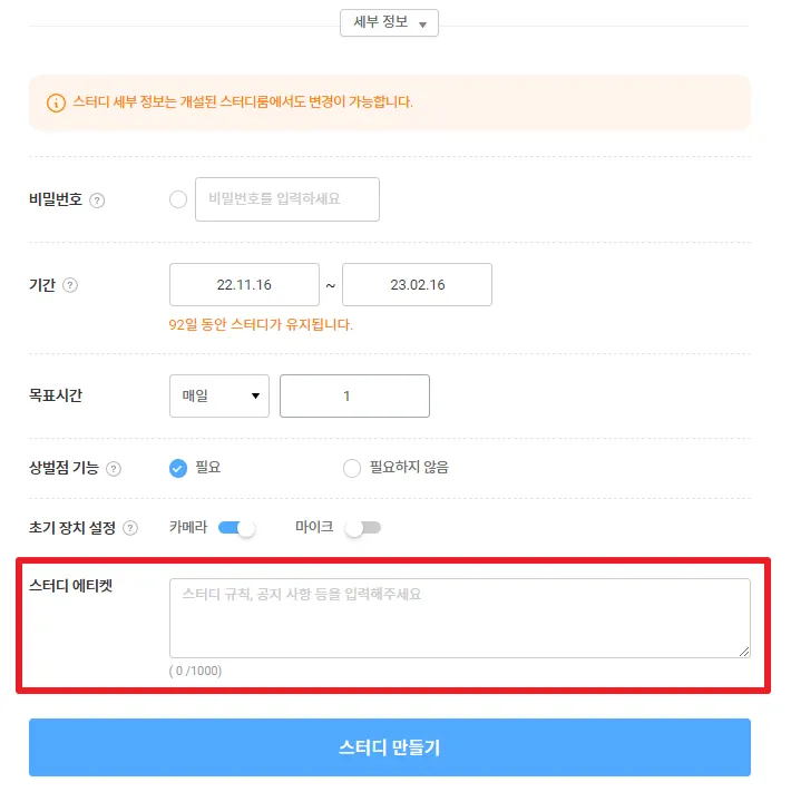 스터디를 오픈해놓고 사용을 하신다면 스터디 에티켓을 적어두는 것이 좋아요!