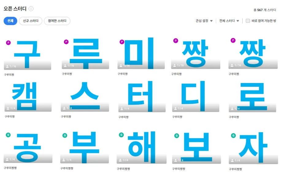 ‘오픈 스터디’ 로 개설하면 홈페이지 하단 오픈 스터디 목록에 방장님이 만드신 스터디룸이 뜨며 클릭하여 입장할 수 있어요.