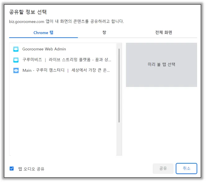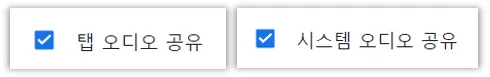 Chrome 탭 공유와 전체 화면 공유를 클릭해 보시면 하단에 오디오 공유 체크박스가 있습니다.