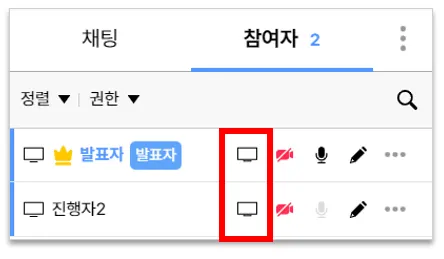 1. 우측 참여자 목록에서 닉네임 오른쪽에 있는 화면 버튼을 클릭해 화면공유 권한을 부여해 주세요.