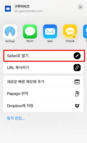 공유하기를 누르고 [Safari로 열기]에서 구루미에 접속합니다.