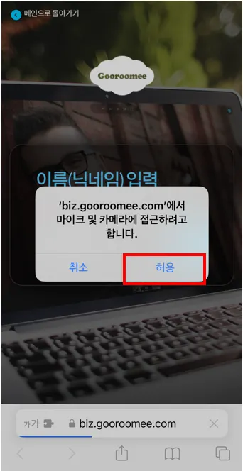 다음으로 이동할 때 ‘마이크 및 카메라에 접근하려고 합니다’라고 뜨는 알림창은 모두 [허용]을 눌러 주세요.