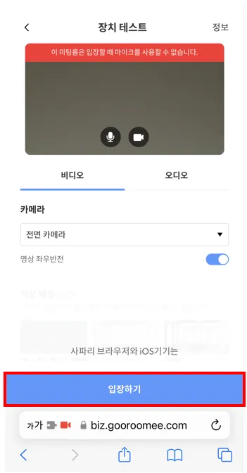 장치 테스트에서 비디오와 오디오가 정상적으로 작동하는지 확인하고 [입장하기]를 누릅니다.