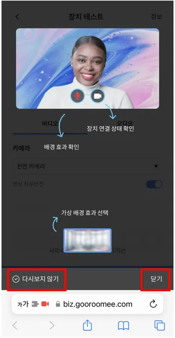 처음 입장했을 때는 장치 테스트 방법을 알려주는 화면이 나올 수 있습니다.
