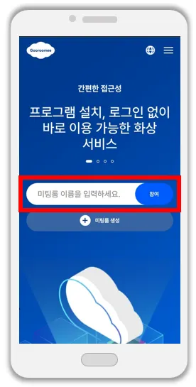 화면 중앙에 있는 방 이름 검색 란에 ‘방 이름’을 입력한 뒤 [참여] 버튼을 눌러주세요.