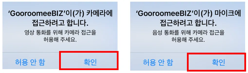 카메라와 마이크 장치에 대한 사용 권한 요청 팝업이 뜨면 ‘확인’ 버튼을 눌러주세요.