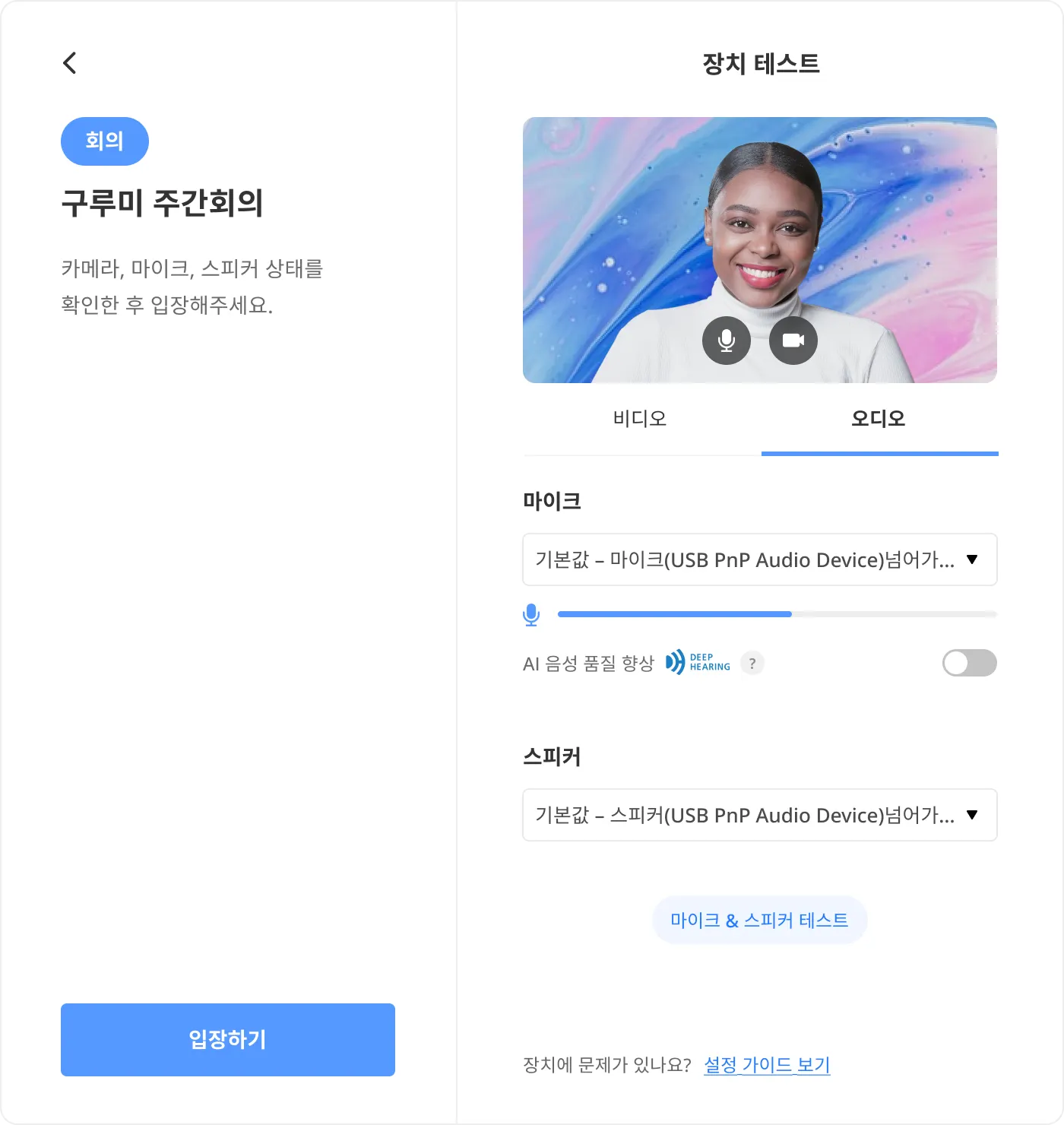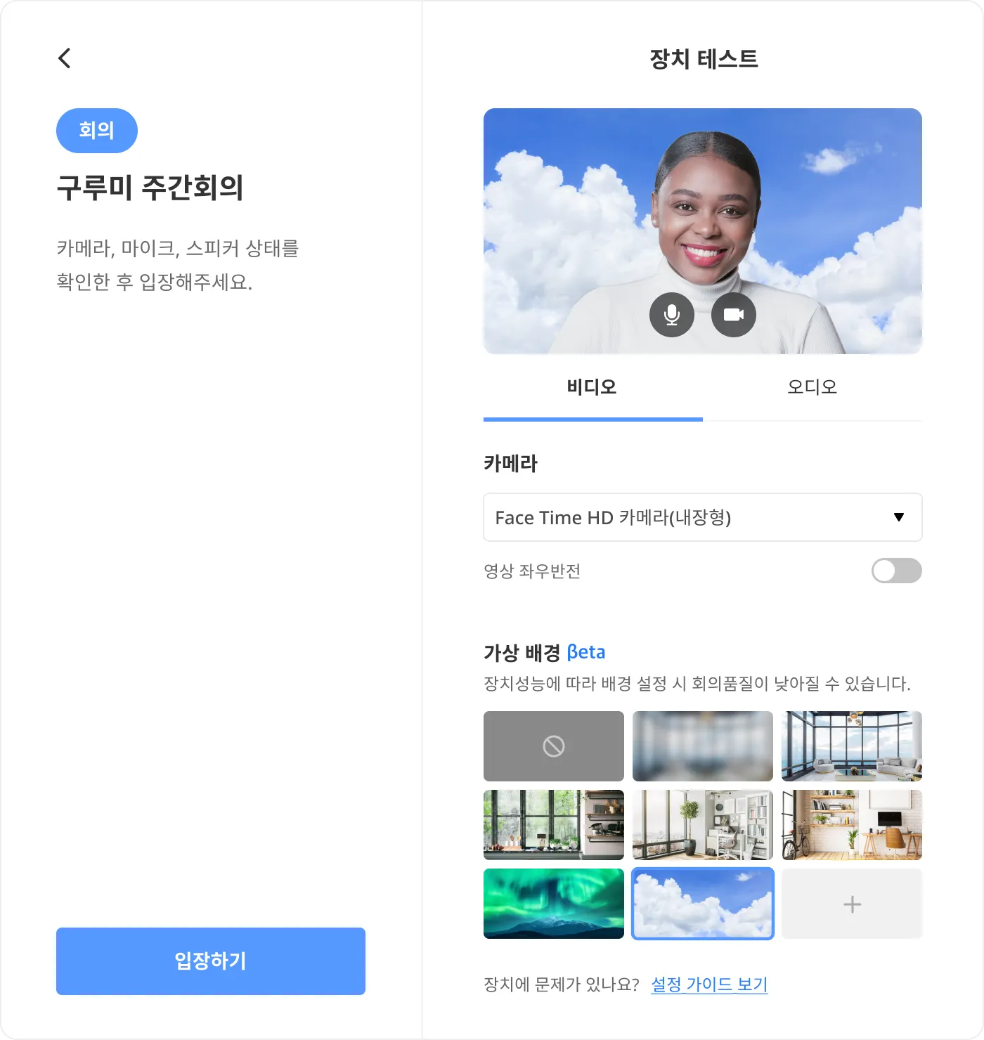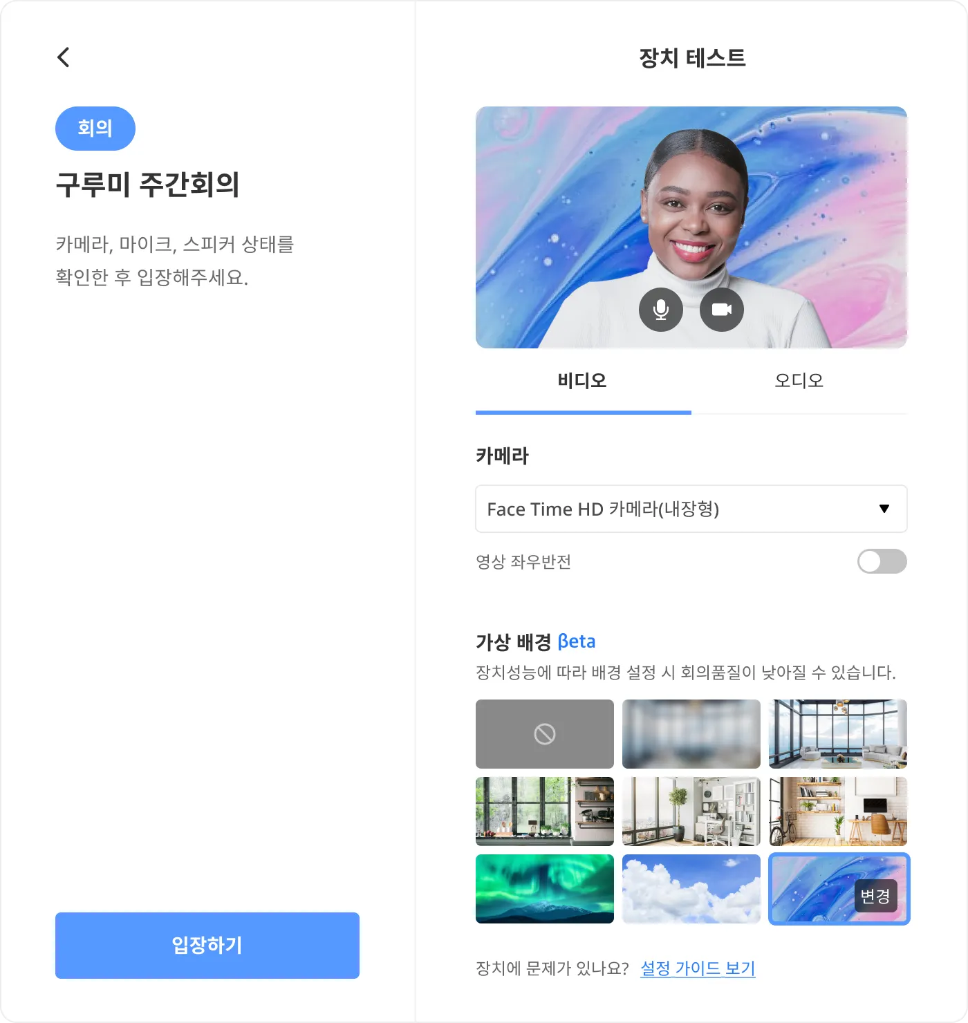 미팅룸을 입장하기 전 입장 대기실에서 장치테스트 및 가상배경 설정을 할 수 있습니다.