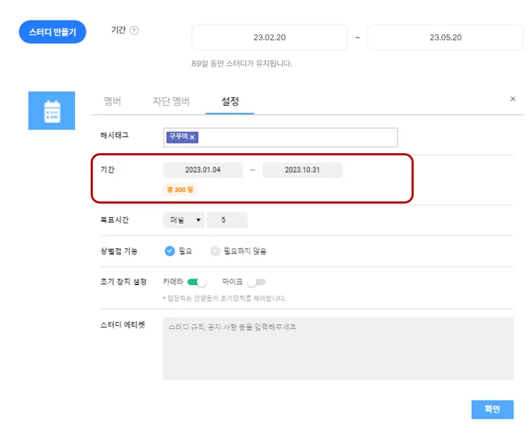 스터디룸 개설 시 세부 정보에서 기간을 설정해 주세요!