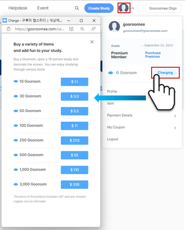 Profile > Charging > Recharging the desired amount of Gooroom.