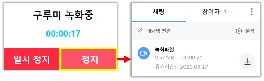 녹화 파일은 녹화를 정지하면 녹화를 진행한 분의 채팅창에 업로드되며