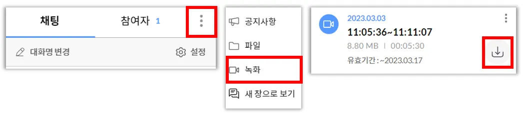 채팅 / 참여자 옆 점 세 개를 눌러 ‘녹화’ 버튼을 눌러주세요.