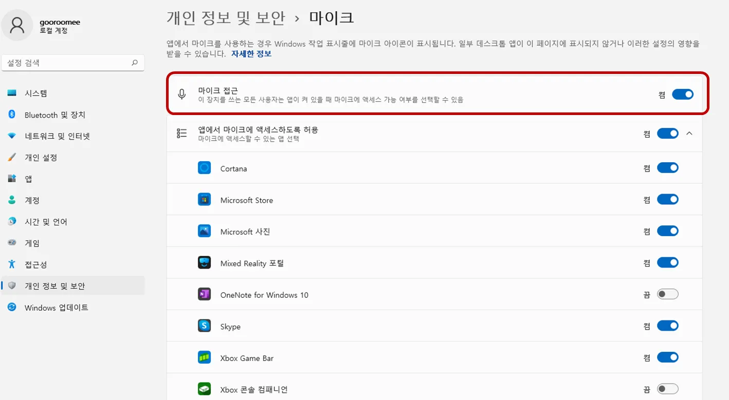 윈도우 검색창에 ‘마이크 개인 정보 설정’이라고 검색하셔서 설정 창을 켠 뒤