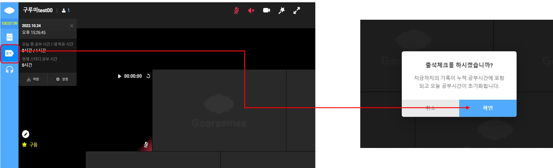 하루 중 스터디방에 처음 입장했다면, 좌측 메뉴 바에 있는 출석 버튼을 눌러주세요.
