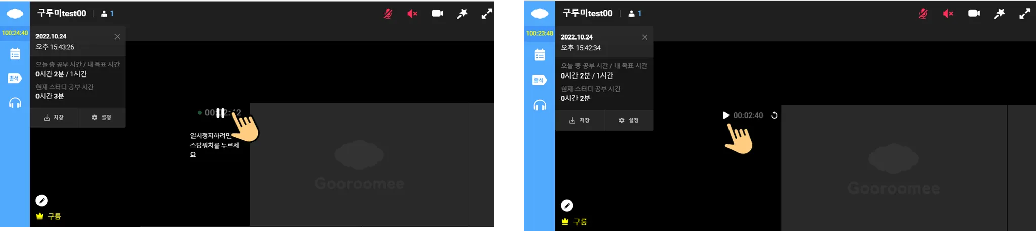타이머 우측의 돌아가는 화살표를 누르면, 공부한 시간이 모두 초기화되어 00:00:00이 됩니다.