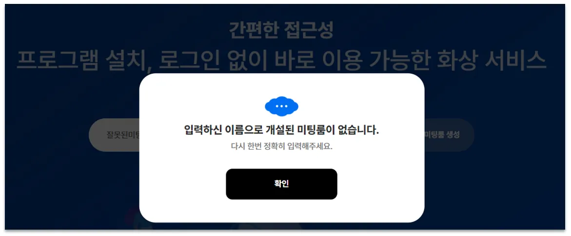 ‘입력하신 이름으로 개설된 미팅룸이 없습니다.’ 라는 알림 창이 뜬다면