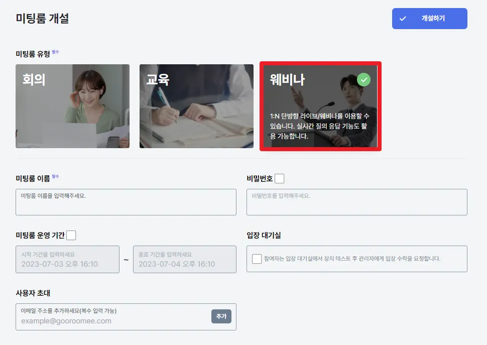 4. 미팅룸 운영 기간 설정을 해두어야 입장한 인원이 모두 퇴장해도 설정된 기간 동안 삭제되지 않고 유지됩니다.