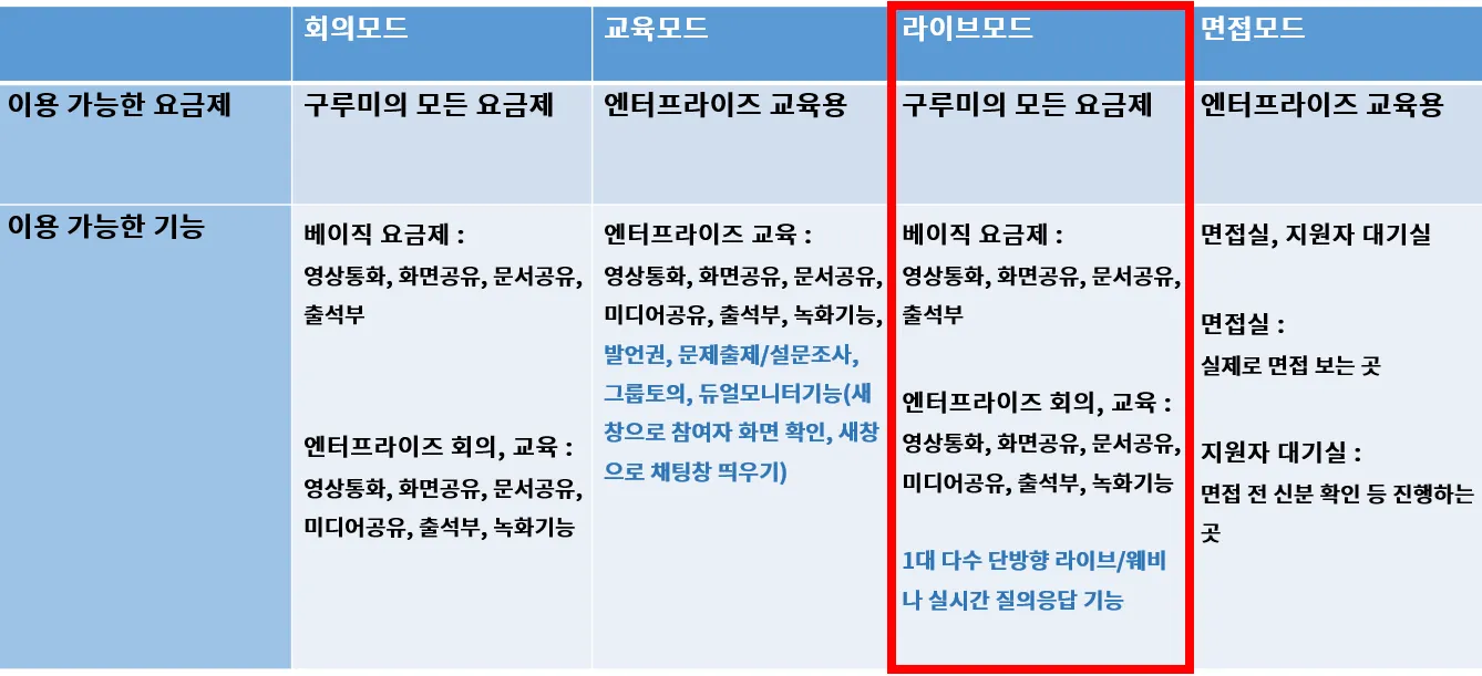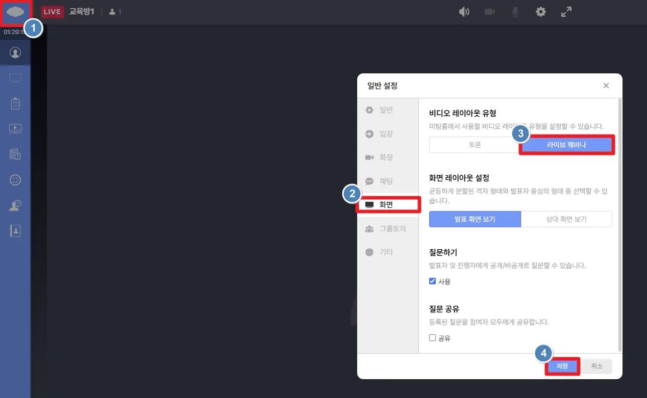 2. 회의나 교육 모드로 미팅룸을 생성한 후, 라이브 모드로 전환하는 방법