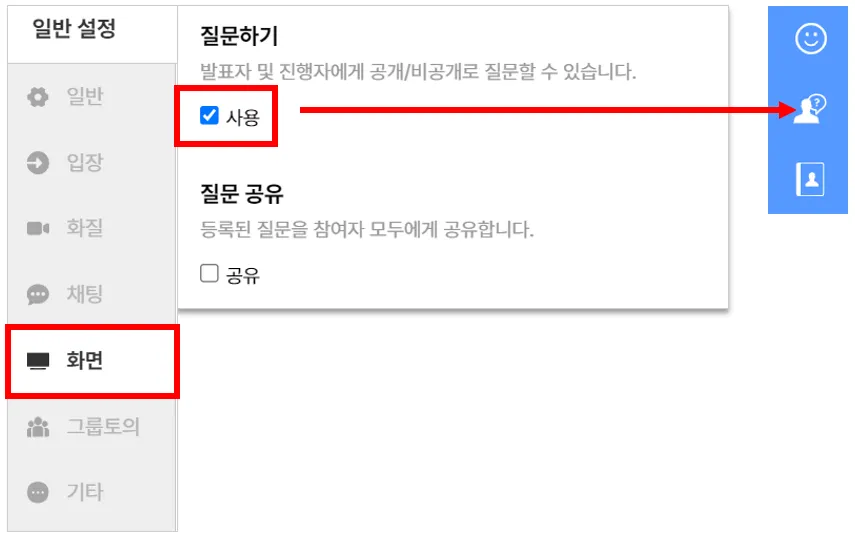 2. 좌측 탭에서 화면 탭을 클릭 후 질문하기를 켜짐으로 설정합니다.
