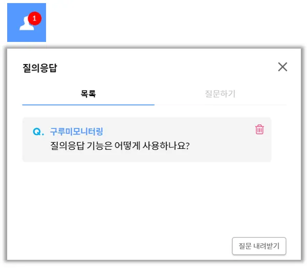 1. 질문이 등록되면 발표자 / 교사의 질의응답 버튼에 빨간색 숫자가 표시됩니다.