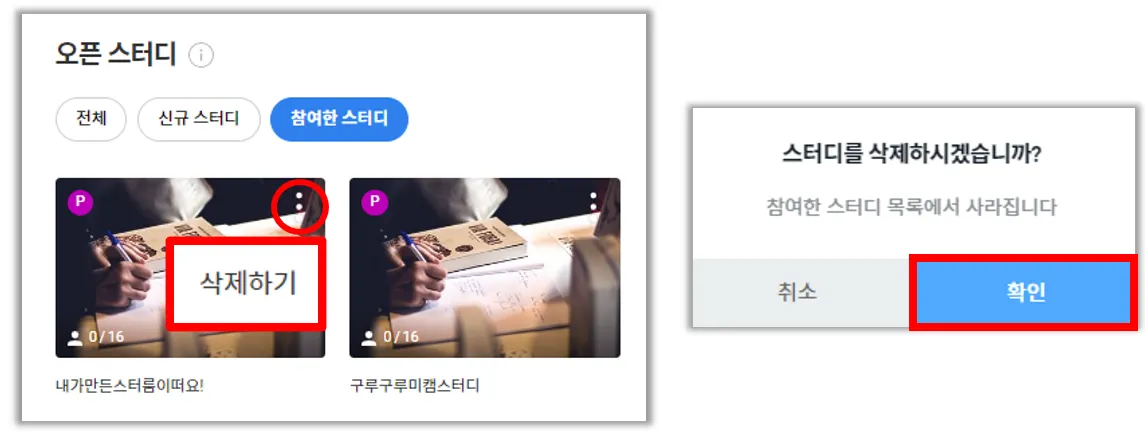 직접 오픈 스터디 - 참여한 스터디에서 점 세 개를 눌러 삭제를 해주셔도 됩니다.