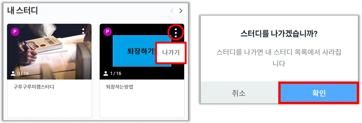 직접 내 스터디 - 해당 방 우상단 점 세 개를 클릭 후 나가기 버튼을 눌러 퇴장해 주셔도 됩니다.