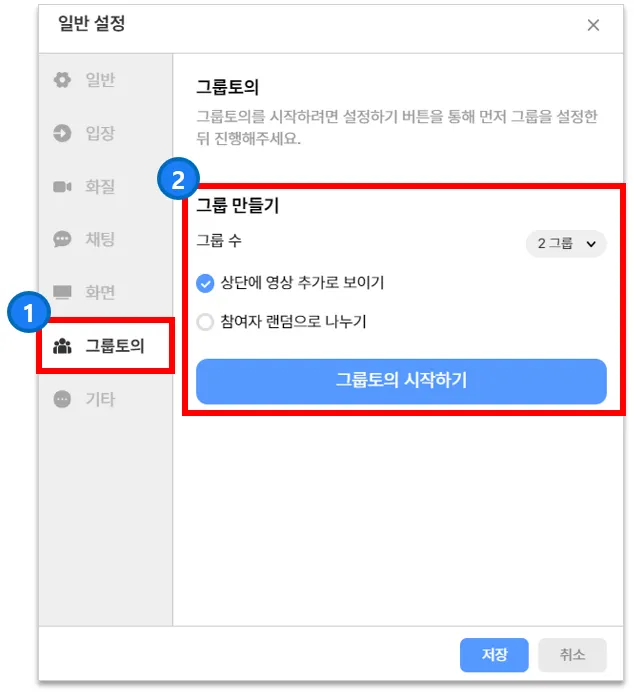 그룹토의 설정에서 그룹 수, 상단에 영상 추가로 보이기, 참여자 랜덤으로 나누기를 설정합니다.