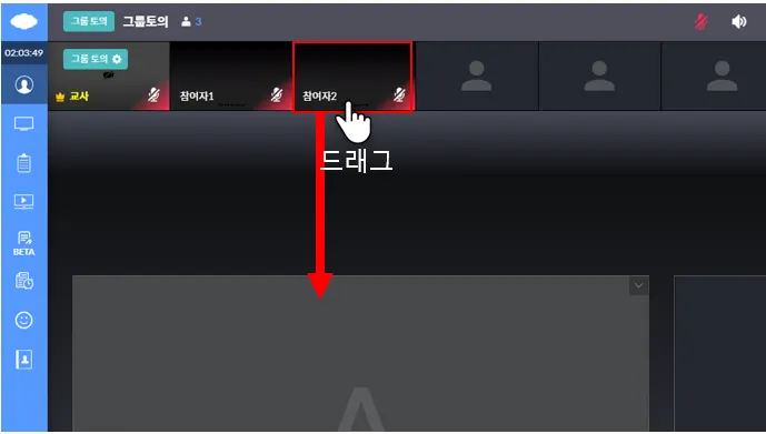 참여자 랜덤으로 나누기를 하지 않으셨다면, 참여자 목록에서 이름을 드래그해 그룹으로 배정해 주세요.