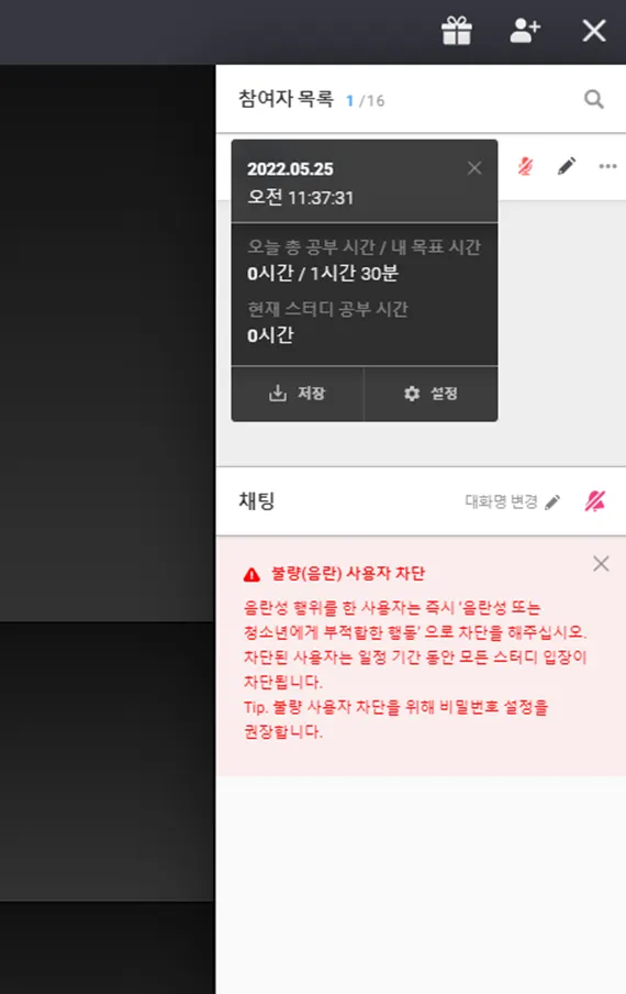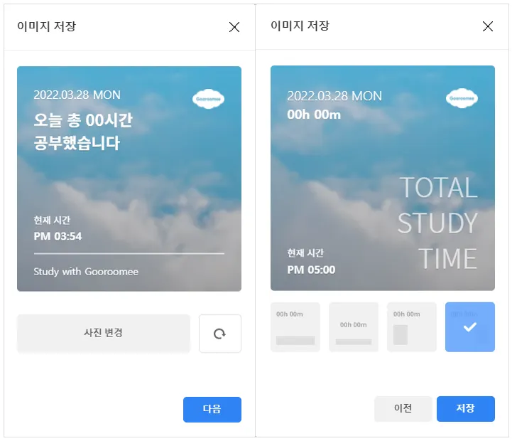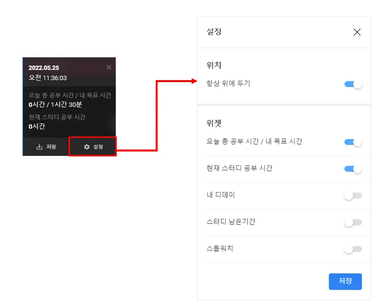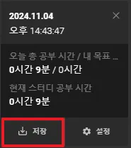 위젯에서 ‘저장’을 누르면 입장한 스터디방에서 오늘 공부한 시간을 이미지로 저장할 수 있습니다.