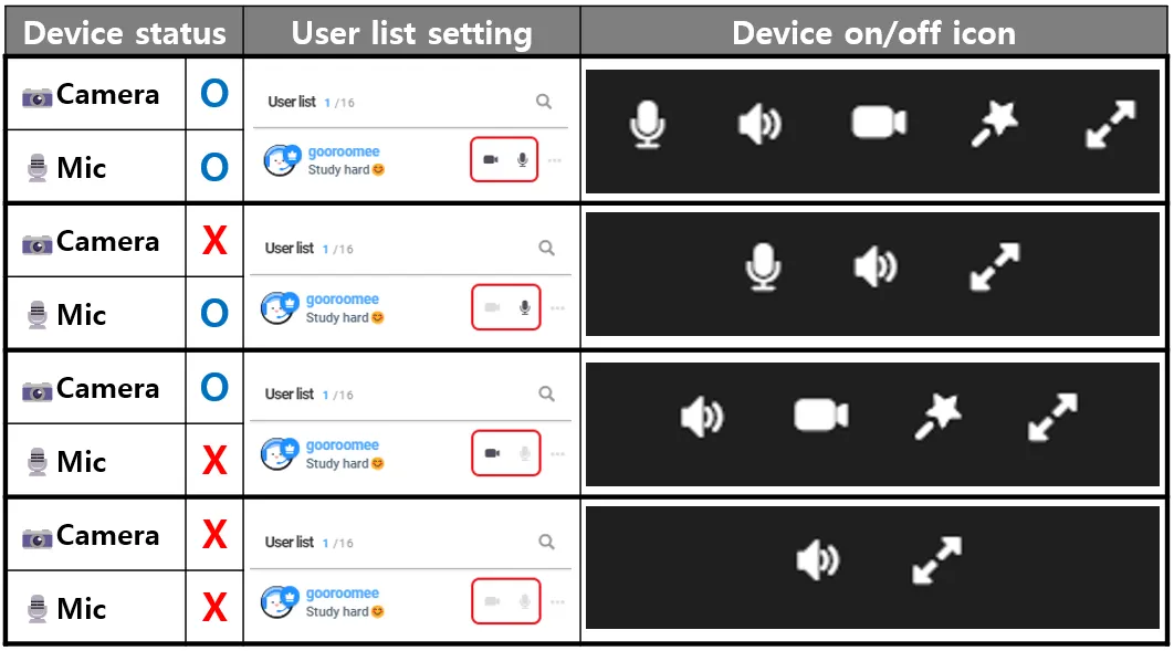 A Host or Managers can toggle camera/microphone access permissions on and off in the User list.