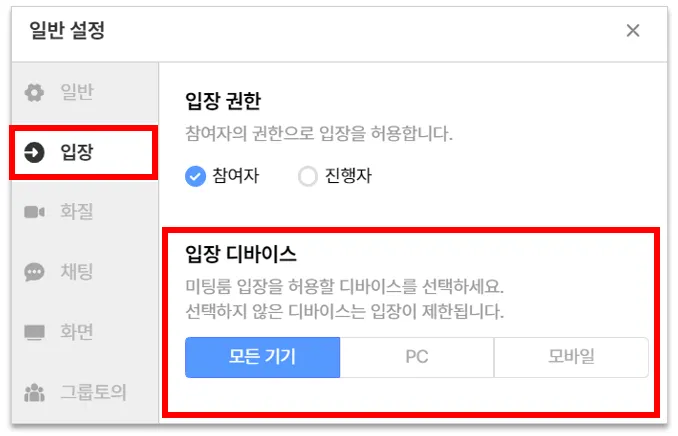 그렇다면 교육 진행하는 측에 연락을 하셔서 일반 설정에서 입장 디바이스를 ‘모든 기기’로 변경해 달라고 요청해 주세요.