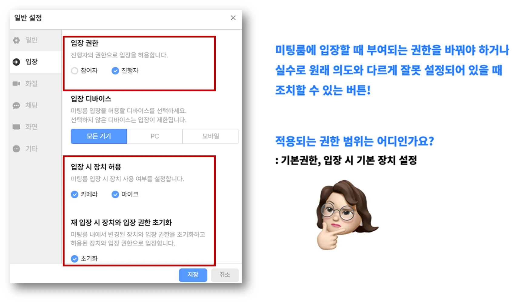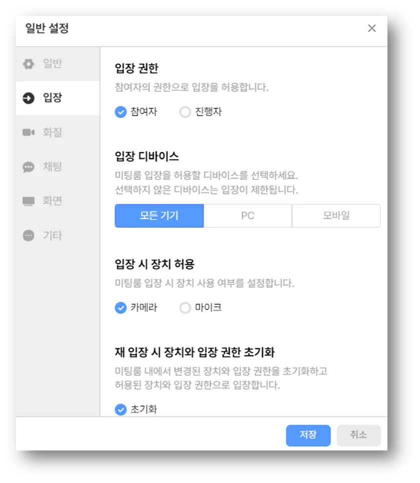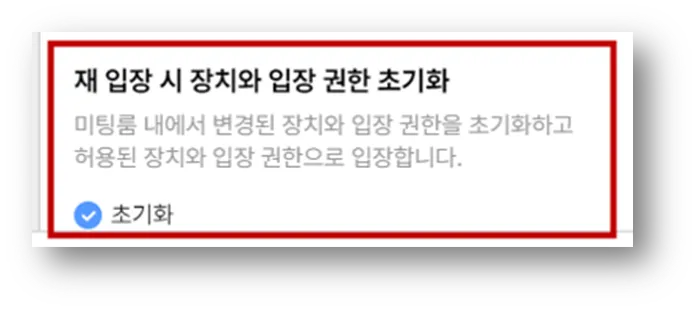 방을 개설한 호스트는 입장 시 기본 장치 설정의 입장 권한 초기화 버튼을 클릭하여 입장하는 참여자에게 주었던 권한을 유지하거나 초기화할 수 있습니다.
