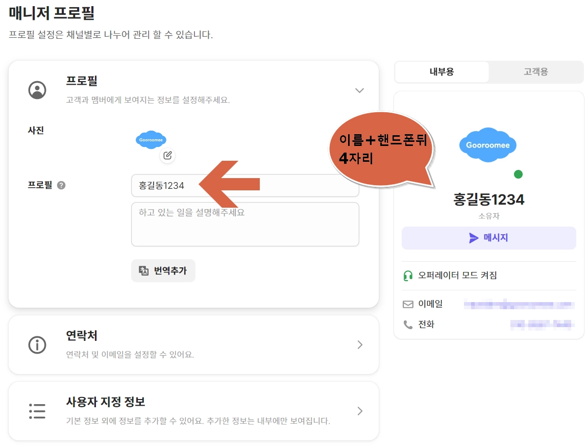 아래 변경방법에 따라 프로필을 이름+휴대폰뒤4자리로 변경합니다.