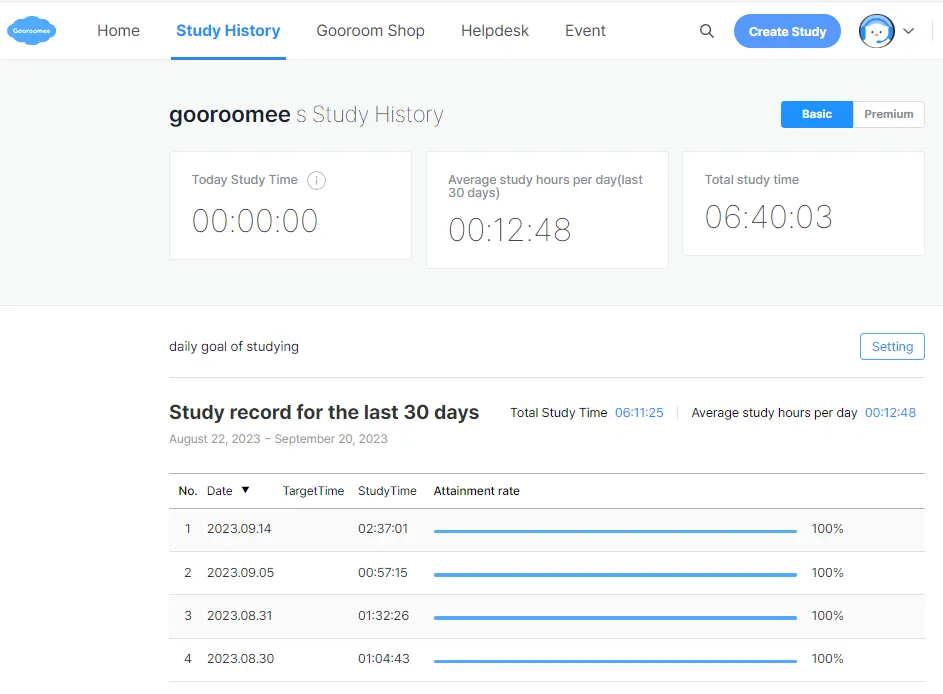 After clicking the "Attendance" button and starting the timer, you can review your saved study records in the "Study History" menu outside the study room.