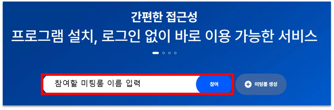 1. 메인화면의 '입장하기’ 입력창에 미팅룸 이름 입력하는 방법